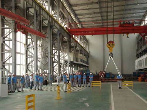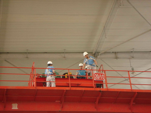 此次預演活動的主要內(nèi)容是,吊車在運行過程中突然停電后工作人員的應(yīng)變能力。演習開始了,首先,停電后吊車工先把開關(guān)手柄放置到“零位”并監(jiān)控總電源。同時,生產(chǎn)部裝配班、物流班部分員工在各自科長的帶領(lǐng)下在吊運物件下設(shè)護欄并監(jiān)護,以防有人誤進危險區(qū)域。其次,生產(chǎn)技術(shù)部維修人員按照安全操作規(guī)程,爬上吊車走臺,盤車移動到合適位置然后慢慢拉、合抱閘把物件送回地面。最后,解除危險。